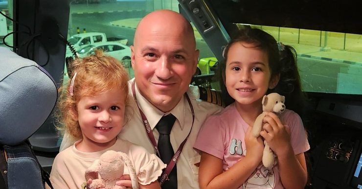 Photo: Captain Damian Griscti is seen posing with his two daughters Kassia (2 years old) and Jasmine (5 years old) after completing the inaugural QA flight to Malta on 2nd July 2025,