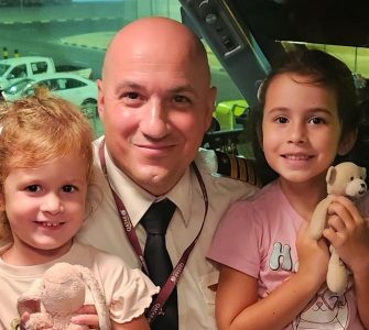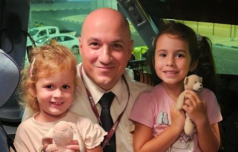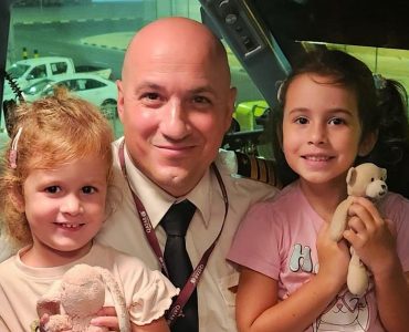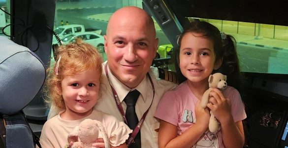 Photo: Captain Damian Griscti is seen posing with his two daughters Kassia (2 years old) and Jasmine (5 years old) after completing the inaugural QA flight to Malta on 2nd July 2025, After a long hiatus, Qatar Airways...